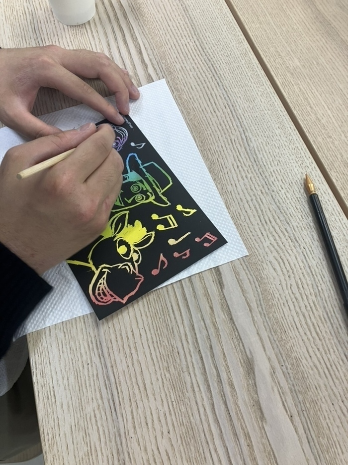 甘いものでひと息ついた後は、スクラッチアートに挑戦! さっきまでの賑やかさとは打って変わって、皆さん、集中して黙々と削っています。 専用のペンで黒いシートをカリカリ削っていくと、下からキラキラしたカラフルな色が出てくるんです。